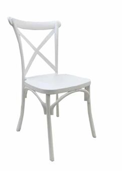 Add a touch of rustic elegance to your event with our white cross-back chair, a perfect blend of classic charm and modern sophistication. Featuring a signature X-frame backrest and graceful curved supports, this chair offers a versatile aesthetic that complements everything from farmhouse weddings to upscale garden parties. Its durable construction and crisp white finish provide a clean, professional look that pairs beautifully with any linen or table setting.