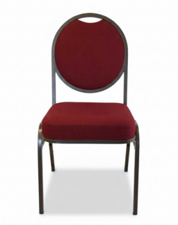 Elevate your formal seating arrangements with our premium banquet chair rental. Designed for both style and stamina, these chairs feature a sophisticated round-back silhouette upholstered in a deep burgundy fabric that adds a touch of classic luxury to any venue. The sturdy, powder-coated metal frame ensures stability for guests, while the densely padded seat and backrest provide superior comfort through long wedding receptions, corporate award ceremonies, or gala dinners. Their stackable design makes logistics seamless, offering a refined and uniform aesthetic for your most prestigious events.