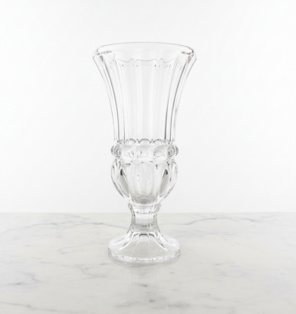 Enhance your floral arrangements with our ornate footed glass trumpet vase, a centerpiece designed for classic elegance. Standing 23.5cm tall this stunning vessel features a flared trumpet silhouette with intricate pressed-glass details and a decorative bulbous stem. The sturdy pedestal base provides excellent stability for taller bouquets or cascading greenery. Its crystal-clear finish and vintage-inspired design make it a perfect choice for wedding reception tables, formal dinners.