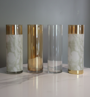 Add a touch of contemporary luxury to your home with this elegant collection of cylindrical vases. Featuring a curated mix of chic marble patterns, shimmering gold accents, and classic clear glass, these pieces offer endless styling possibilities. Whether used as a clustered centerpiece or individual accents, their sleek, minimalist design elevates any tabletop or event decor with sophisticated flair.