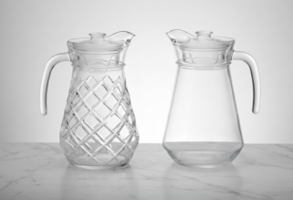 Provide refreshing beverages with style using our premium glass jug rental set. This collection offers two distinct aesthetic options to suit your event's theme: a sophisticated pitcher featuring a classic diamond-cut lattice pattern for added texture and sparkle, and a sleek, minimalist tapered jug for a clean, modern look. Both pitchers come equipped with ergonomic handles, integrated pouring spouts, and protective lids to keep water, juices, or signature cocktails fresh throughout your celebration. Ideal for garden weddings, corporate luncheons, or brunch buffets, these high-quality glass carafes bring a touch of polished elegance to every table.