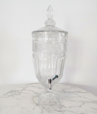 Elevate your beverage service with our 5L cut crystal glass juice dispenser, featuring a sophisticated vintage-inspired design. This stunning piece showcases intricate diamond-cut patterns and vertical fluting, topped with a matching pointed lid for a grand presentation. Equipped with a durable chrome-finished spigot and a sturdy square pedestal base, it combines ornate beauty with practical functionality. Ideal for weddings, garden parties, or upscale brunches, it provides a professional, high-end look for any occasion.