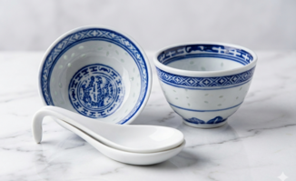 Bring a touch of cultural elegance to your next event with our oriental soup service rental. This beautiful set features classic ceramic bowls adorned with traditional blue and white patterns, intricate geometric borders, and iconic central motifs. Accompanied by matching deep-well ceramic spoons, this collection is designed for both authenticity and durability. Whether you are hosting a themed gala, an intimate dinner party, or a multi-course corporate event, these high-quality pieces offer a polished and sophisticated way to serve traditional broths and appetisers.