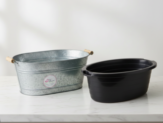 Keep drinks perfectly chilled with our versatile beverage tub collection. This set includes a classic galvanised metal tub with wooden handles for a rustic aesthetic and a durable black plastic basin with molded handles for practical, high-volume service. Both oval-shaped tubs offer ample space for ice and bottled refreshments. They are the ideal choice for self-service drink stations at weddings, barbecues, or corporate outdoor events.