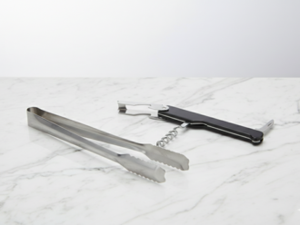 Equip your beverage station with our professional bar tool set, featuring high-quality stainless steel essentials for seamless service. This set includes a pair of durable ice tongs with serrated edges for a secure grip and a classic waiter’s friend corkscrew.