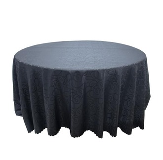 Add a layer of sophisticated texture to your dining setup with our premium patterned table linen rental. This full-length circular tablecloth features an intricate, tonal damask or floral weave that catches the light, providing a subtle yet luxurious depth to your table presentation. The deep charcoal or black hue offers a bold, dramatic foundation that allows your tableware and centerpieces to stand out. Perfect for gala dinners, evening wedding receptions, or high-end corporate events, this high-quality fabric drape ensures a polished and seamless look for any large-scale banquet.