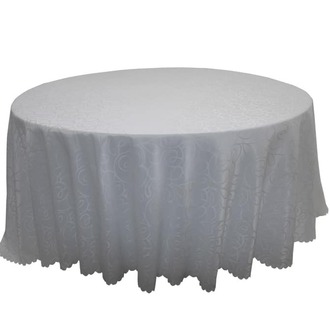 Enhance your event's aesthetic with our elegant white patterned table linen. This high-quality circular tablecloth features a sophisticated, tone-on-tone damask or floral weave that adds a delicate layer of texture and luxury to your dining space. The crisp white finish provides a timeless, clean foundation that complements any color palette, while the intricate pattern catches the light to create a subtle shimmer across your tablescape. Designed with a full-length drape and a decorative scalloped edge, this linen is the perfect choice for weddings, formal banquets, and upscale corporate luncheons.