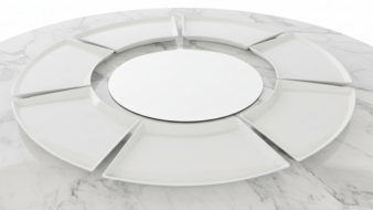Create an interactive dining experience with our Lazy Susan ceramic platter set. This elegant collection features seven curved, wedge-shaped ceramic dishes that fit perfectly around a central circular platter, forming a complete service ring. The crisp white finish and modern silhouette make it a versatile choice for serving appetisers, tapas, or condiments at weddings and corporate events. Its modular design allows for effortless sharing, ensuring a functional and sophisticated addition to any banquet table.