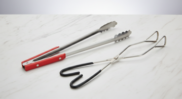 Equip your catering stations with our professional-grade serving tongs, designed for both durability and precision. This rental set includes versatile options to handle any menu item: a pair of scalloped-edge stainless steel tongs with an ergonomic red heat-resistant handle for secure gripping, and a specialised wire-frame tong perfect for delicate pastries or salad service. These high-quality tools provide a hygienic and efficient way for guests or waitstaff to serve food at buffets, weddings, or corporate luncheons, ensuring a smooth and polished dining flow.