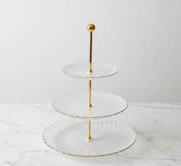 Elevate your dessert table with our 3-tier glass cupcake stand, designed to showcase treats with a touch of luxury. This sophisticated piece features textured glass plates with delicate gold-rimmed edges and a sleek gold central pillar. The tiered design provides ample space for cupcakes or macarons, creating a beautiful vertical display that saves table space. Perfect for high teas or weddings, it adds a refined aesthetic to any food presentation.