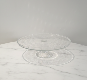 Add a touch of timeless charm to your dessert table with our vintage-inspired etched glass cake stand. This elegant piece features a wide, flat surface decorated with intricate floral etchings and a delicate scalloped rim. The sturdy, fluted pedestal base provides elevated stability, making it the perfect showcase for wedding cakes, tarts, or pastries. Its classic crystal-clear design captures light beautifully, providing a refined and professional presentation for any special occasion.