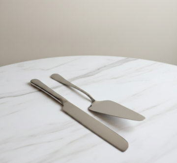 Serve your desserts with precision using our stainless steel cake lifter and knife set, designed for effortless elegance. This duo features a long, slender cake knife for clean slicing and a wide, tapered lifter to ensure perfect presentation from plate to guest. With a polished finish and minimalist handles, this set offers a professional look that complements any cake stand. Durable and timeless, it’s an essential addition for weddings, anniversaries, or formal events.