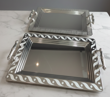 Impress your guests with our polished mirror serving tray set, featuring two distinct, high-shine designs. These elegant rectangular trays are accented with intricate border patterns—one with a geometric Greek key motif and the other with a graceful wave design. Equipped with sturdy, decorative silver handles for easy transport, they are perfect for serving drinks, hors d'oeuvres, or displaying decor. Their reflective surfaces and classic styling make them a sophisticated choice for weddings, cocktail hours, and upscale corporate events.