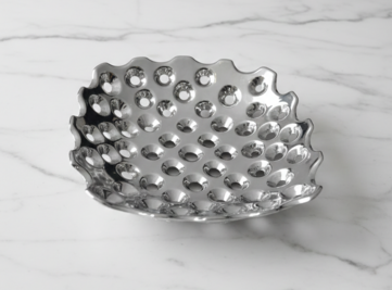 Add a modern, artistic touch to your table service with our perforated silver bread tray. This unique piece features a high-shine chrome finish and a distinctive "honeycomb" perforated design that allows for airflow while creating a striking visual pattern. Its organic, slightly scalloped edges provide a contemporary silhouette that elevates the presentation of artisanal breads, rolls, or pastries. This durable and stylish tray is an excellent choice for modern weddings, sleek corporate luncheons, or upscale dinner parties.