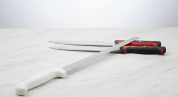 Equip your catering staff or buffet station with our high-performance cutlery rental set. This collection features precision-crafted blades designed for effortless service, including a long, serrated bread knife with an ergonomic white handle for clean slices of artisan loaves and pastries. Complementing the set are professional carving knives with contoured, heat-resistant handles, perfect for slicing through roasts and poultry with expert control. These durable, commercial-grade tools ensure a smooth and professional carving experience for weddings, holiday banquets, and upscale corporate dinners.