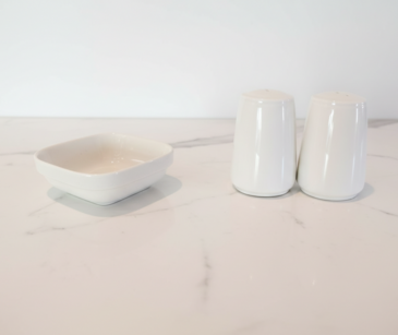Complete your dining presentation with our white ceramic salt, pepper, and butter dish set. This trio features a compact, square butter dish and a pair of sleek, tapered salt and pepper shakers with a smooth, high-gloss finish. Their minimalist design and neutral color palette provide a clean, professional look that fits seamlessly into any event setting, from casual brunches to formal weddings. Durable and stylish, these essentials are perfect for shared tables or individual guest service.