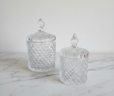 Add a sparkle of sophistication to your dessert table with our diamond-cut glass candy jars, featuring an intricate geometric pattern that catches the light beautifully. These elegant vessels come with matching pointed lids, making them perfect for storing and displaying colorful sweets, chocolates, or mints. Crafted from high-quality clear glass, they offer a classic vintage aesthetic that complements any event theme. Their professional finish ensures a refined look for wedding candy buffets, corporate events, or home décor.