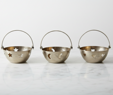 Each holder features a functional curved swing handle, allowing them to be easily repositioned or even hung as part of a larger decorative display. Their polished brass finish and whimsical silhouettes make them an ideal choice for creating a cozy atmosphere at wedding receptions, themed parties, or intimate evening celebrations.