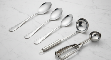 Equip your buffet or banquet line with our versatile stainless steel serving utensil set. This rental collection features high-quality tools designed for precision and durability, including three large oval serving spoons for side dishes, a deep soup or sauce ladle, and a spring-loaded portion scooper for consistent serving. Each piece is crafted with a polished mirror finish and ergonomic handles, providing a clean and professional aesthetic that elevates the service standards of weddings, corporate luncheons, and large-scale catering events.