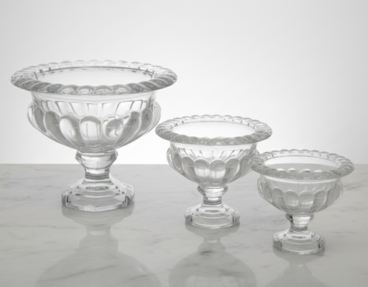 Enhance your event's decor with our classic glass pedestal bowl collection. These sophisticated centerpieces feature a timeless urn-style silhouette with a decorative scalloped rim and a ribbed, fluted base that catches and reflects light beautifully.