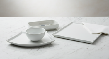 Make a bold statement at your next event with our contemporary geometric tableware rental. This unique collection breaks away from traditional circular designs, featuring sharp-edged square platters, striking fan-shaped plates, and deep rectangular serving dishes. Finished in a minimalist matte white, these pieces provide a high-fashion, architectural backdrop for modernist cuisine or artistic hors d'oeuvres. Ideal for gallery openings, upscale corporate events, or avant-garde weddings, this rental set allows for creative table configurations that will leave a lasting impression on your guests.