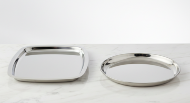 Enhance your event's service standards with our premium stainless steel serving tray rentals. This set features two distinct silhouettes—a modern soft-square platter and a classic circular tray—both finished with a high-luster mirror polish. The raised edges provide a secure grip for waitstaff and prevent spills, making them an ideal choice for circulating hors d'oeuvres or delivering champagne service. Durable, elegant, and easy to clean, these trays offer a sleek, professional aesthetic that elevates the presentation of any upscale wedding, corporate gala, or cocktail reception.